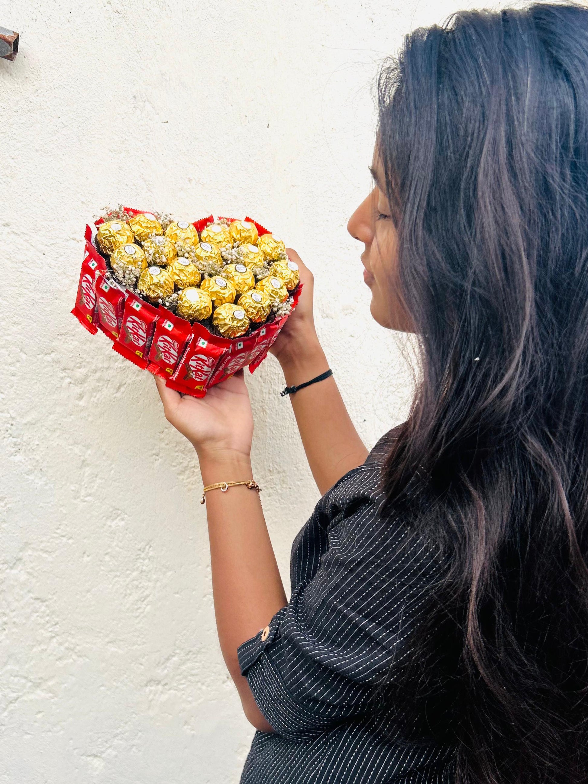 Indulge in a delightful blend of sweetness and love with our Chocolate Heart Bouquet! Perfectly crafted with Ferrero Rocher and KitKat, this bouquet is a treasure of rich flavors and heartfelt charm. Whether it’s a romantic surprise or a thoughtful gift, this sweet creation is sure to melt hearts and create unforgettable moments. Because love and chocolate are always a perfect match!