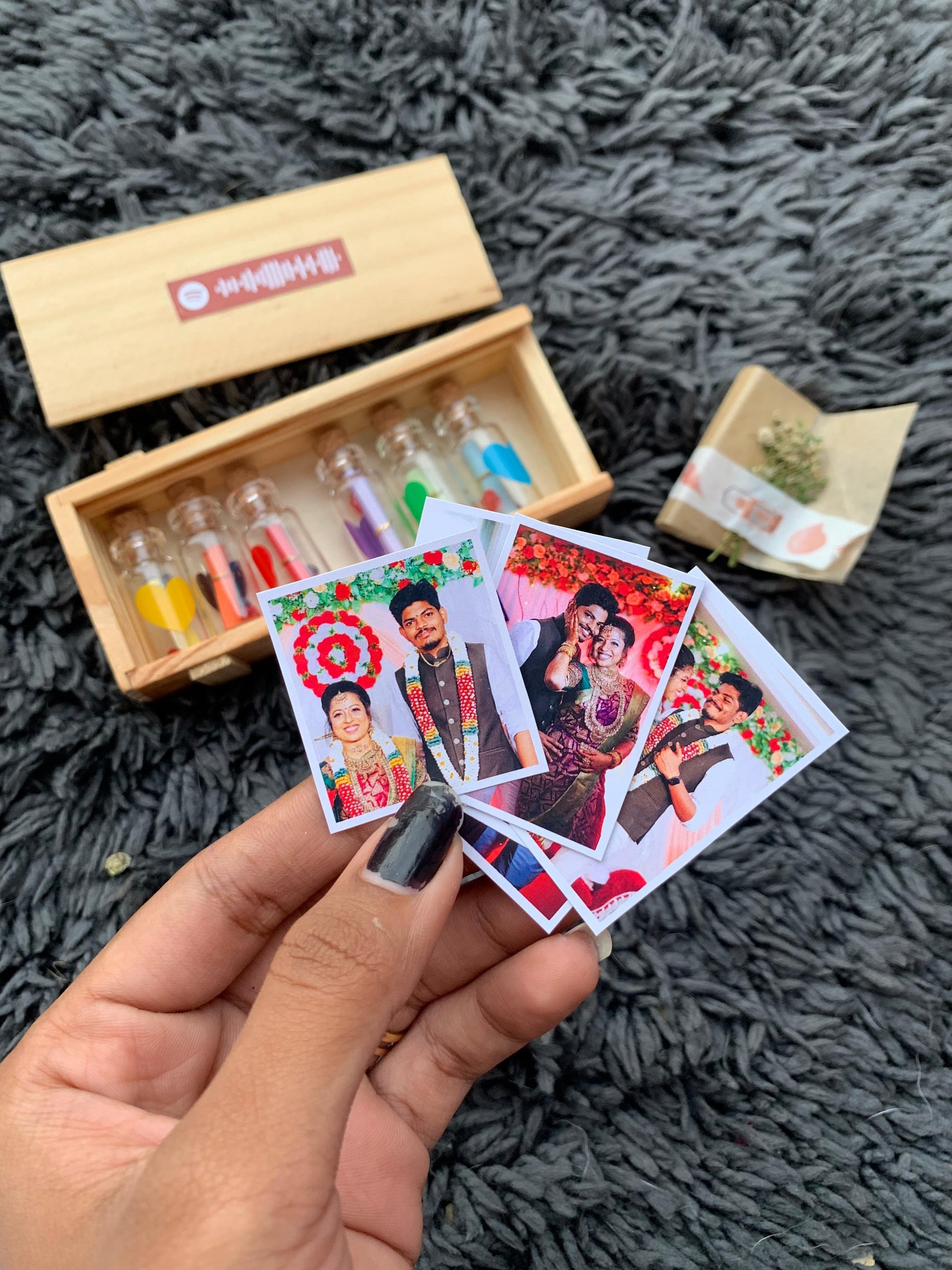 Presenting our FOR YOU Melody Memory Box, a heartfelt treasure that combines love, memories, and music! Inside this beautifully crafted wooden box, you’ll find 5 personalized photos and a special Spotify code to your favorite song. Paired with 7 mini glass bottles holding handwritten messages( customised by you ) this keepsake is the perfect way to share cherished moments and a tune that speaks to your heart. A gift that truly says it all!