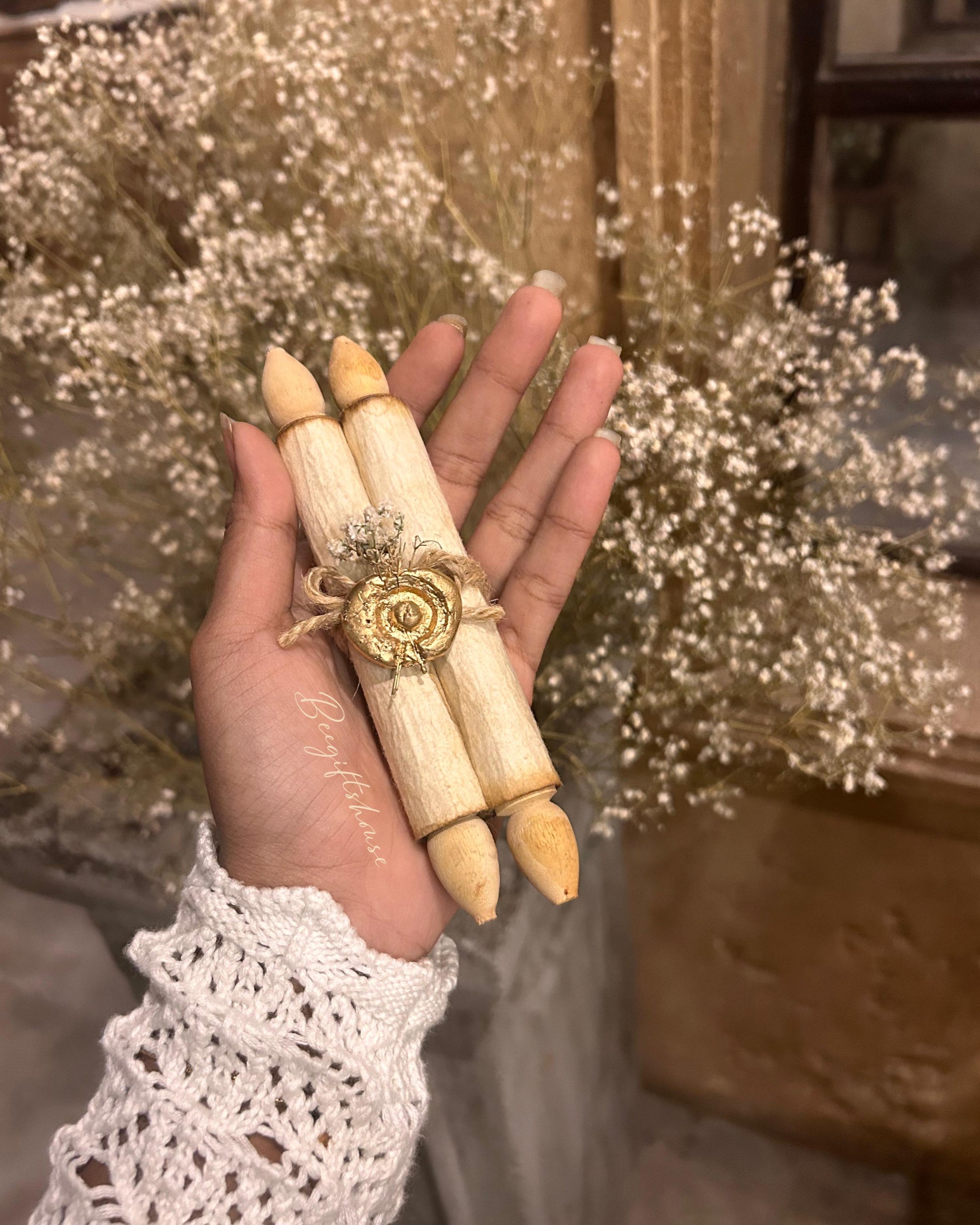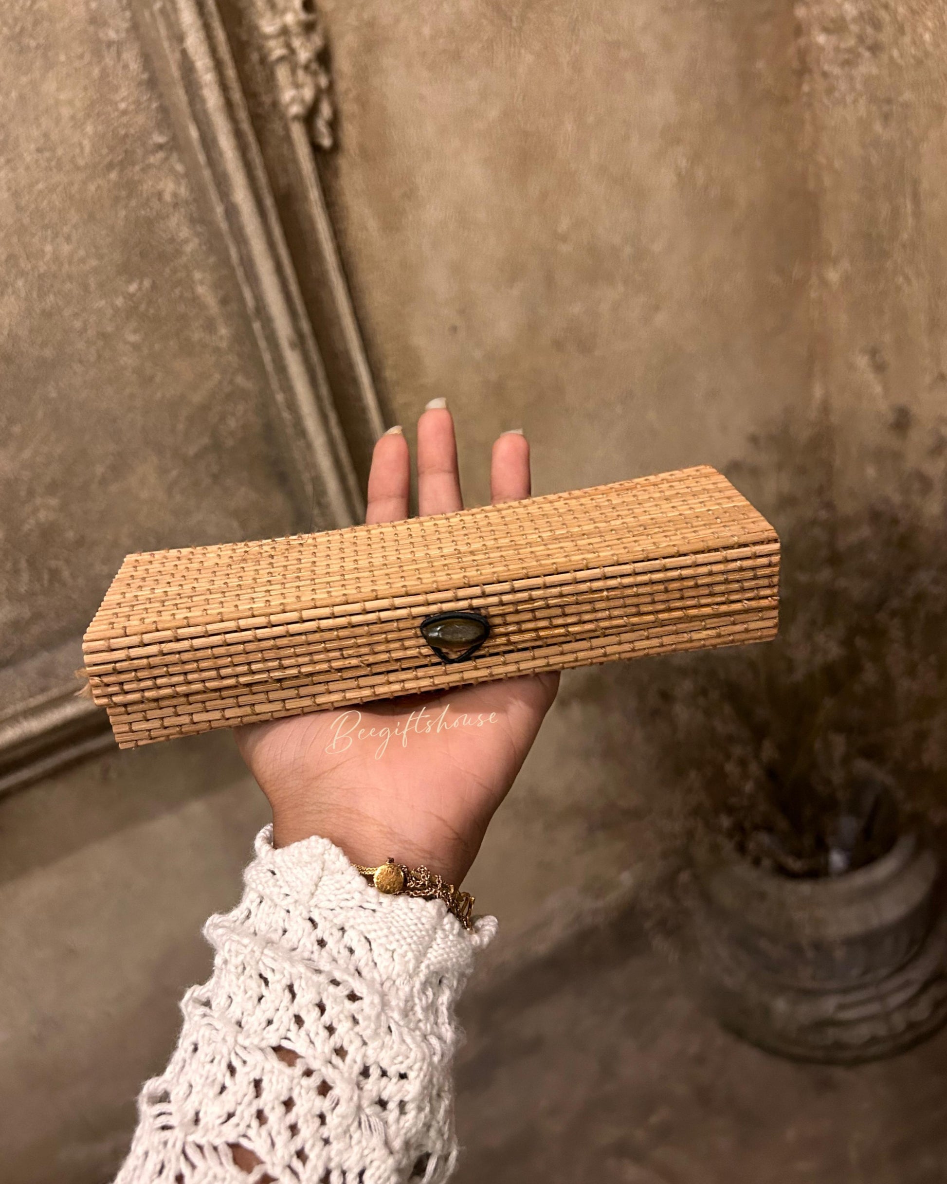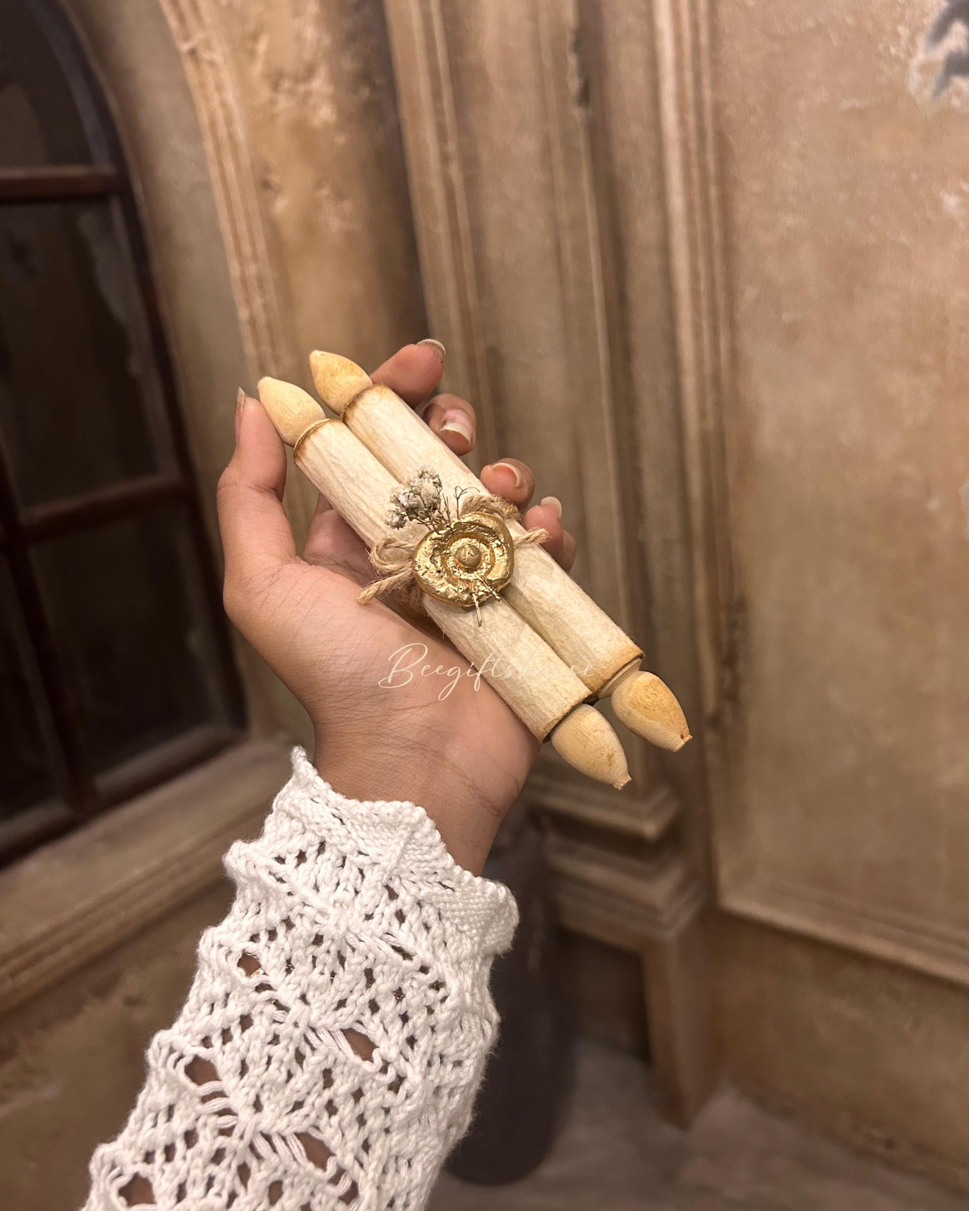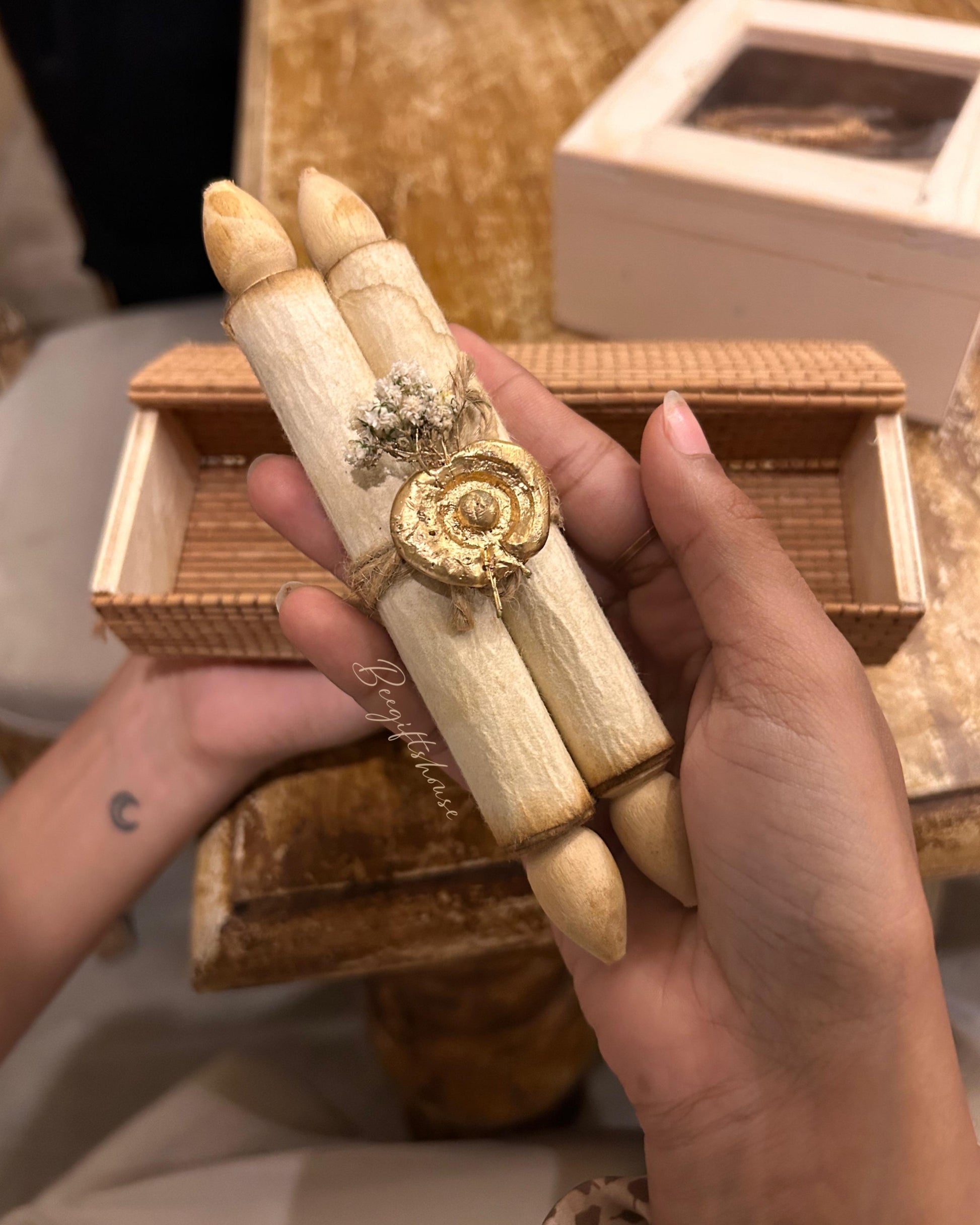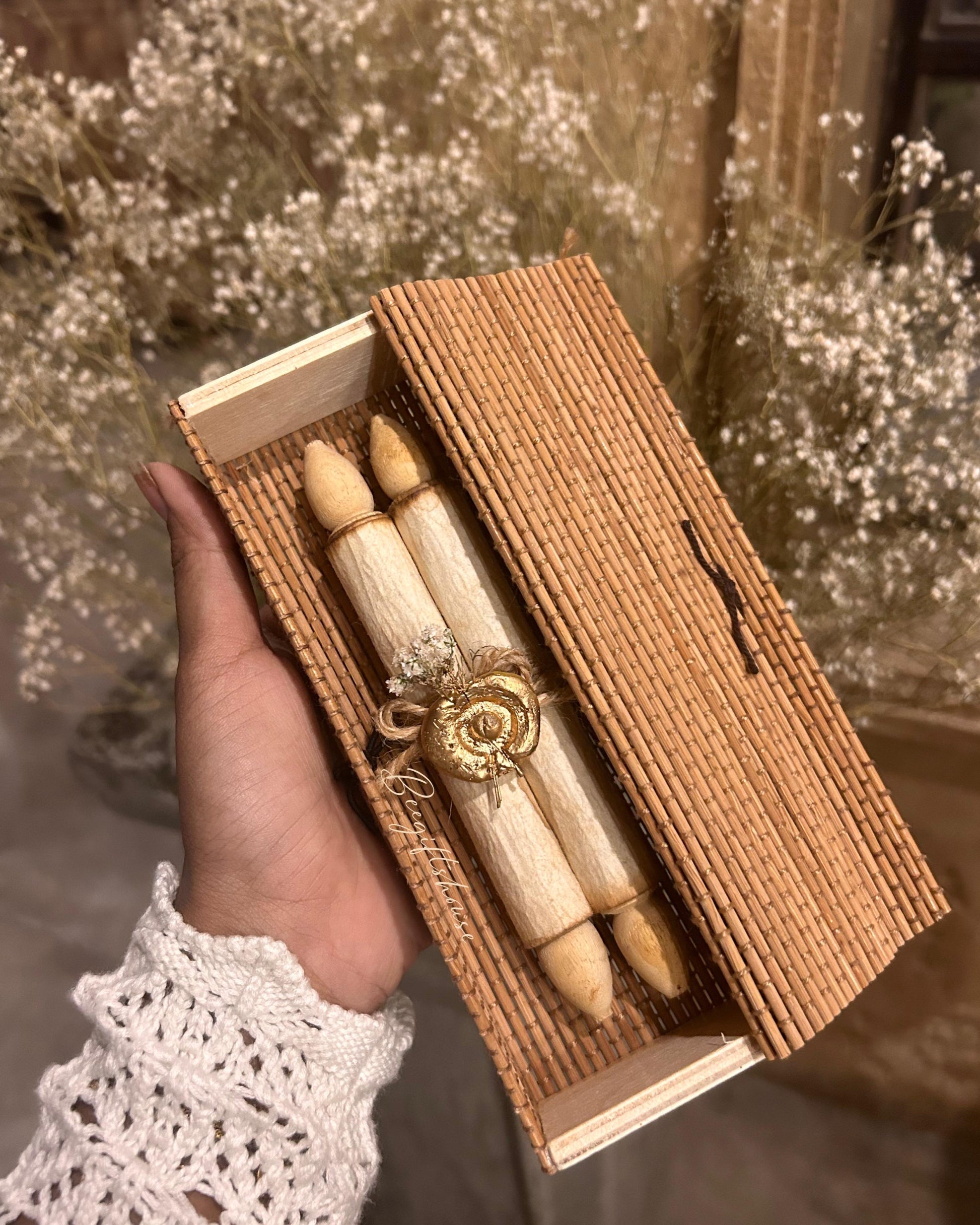 One handcrafted bamboo wood box with one scroll handwritten letter ( made up of handmade paper ) with sealed with wax and dried leaves and jute rope